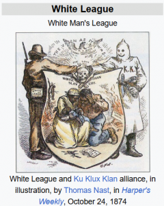 This has happened before—that sick feeling deep in my interior where words do not exist to describe it. Usually, it was caused by something like seeing a bill of sale from one of my enslaver relatives about selling a child. Or buying one. This time it hits closer because I am named for the man about whom I have just learned participated in the White League. The man is my great-grandfather, and he is part of me. In today’s language the White League would be described as a white supremacist quasi-military terrorist organization. It started in 1874 in the South to intimidate freedmen into not voting and prevent the then Republican Party from getting power.